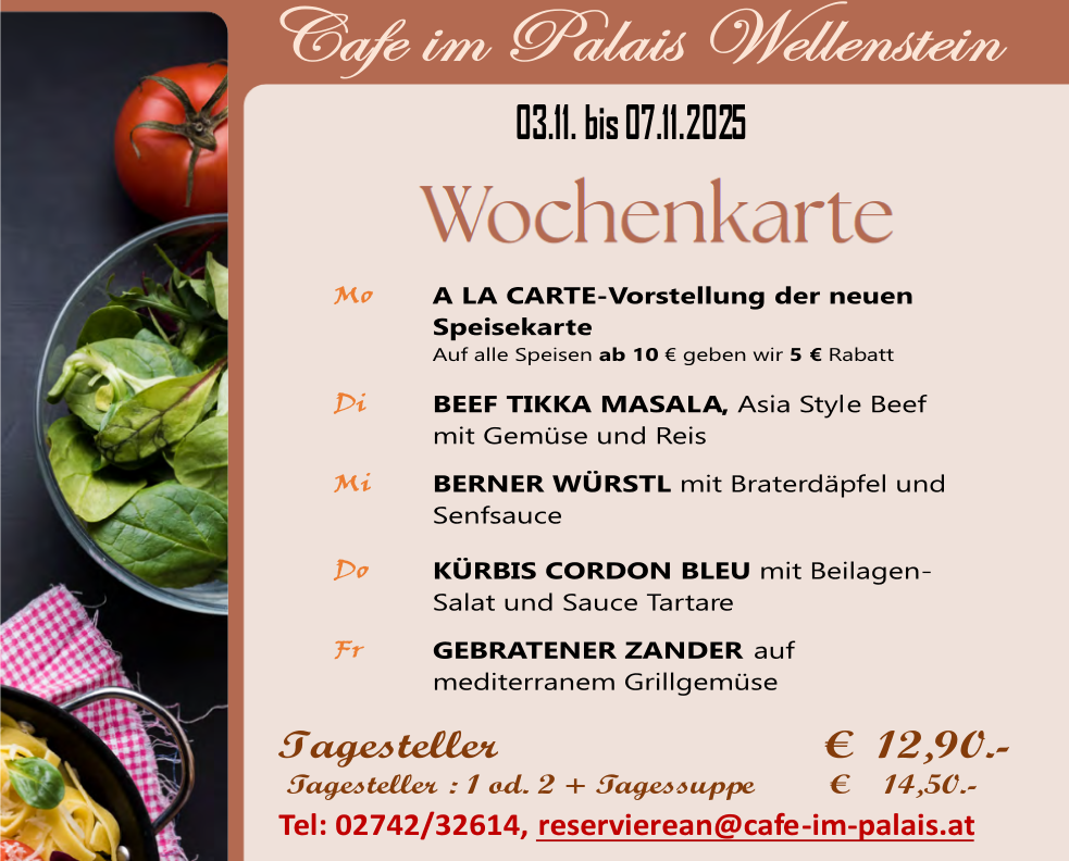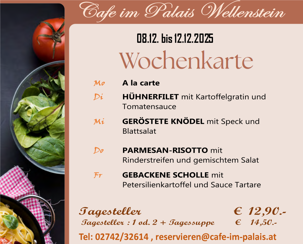 Wechselnde Tagesgerichte, gut sortierte Mehlspeisentheke, Brötchenservice.